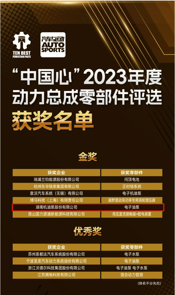 2023年11月8日 ,“中國(guó)心”2023年度動(dòng)力總成零部件評(píng)選公布,湖南機(jī)油泵股份有限公司研發(fā)的電子油泵作為動(dòng)力總成潤(rùn)滑系統(tǒng)的“心臟”,榮獲了業(yè)界具影響力的金獎(jiǎng)。這一殊榮不僅是對(duì)湖南機(jī)油泵不懈追求卓越品質(zhì)和技術(shù)領(lǐng)先地位的認(rèn)可,也標(biāo)志著公司在全球動(dòng)力總成領(lǐng)域的領(lǐng)跑者地位。